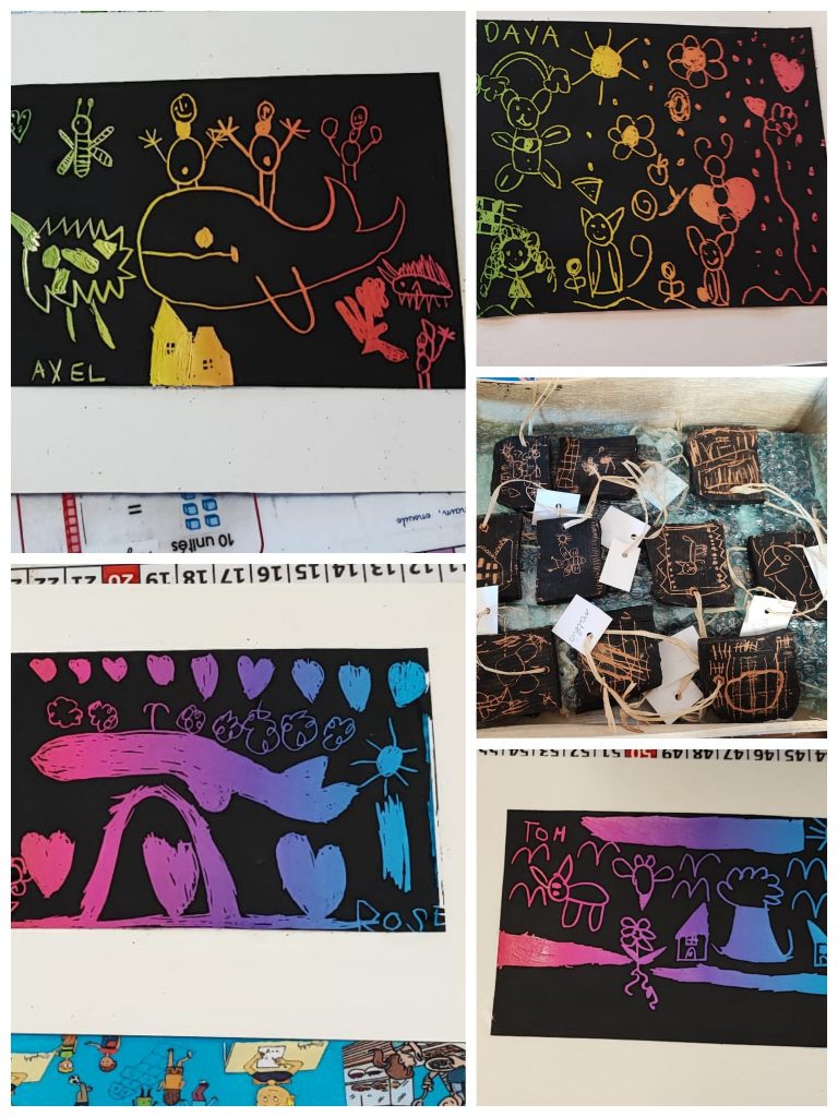 Les CP CE1 : Nous avons dessiné sur des pierres noires avec des petits silex. Nous avons ensuite réalisé un dessin libre en grattant une petite plaque.