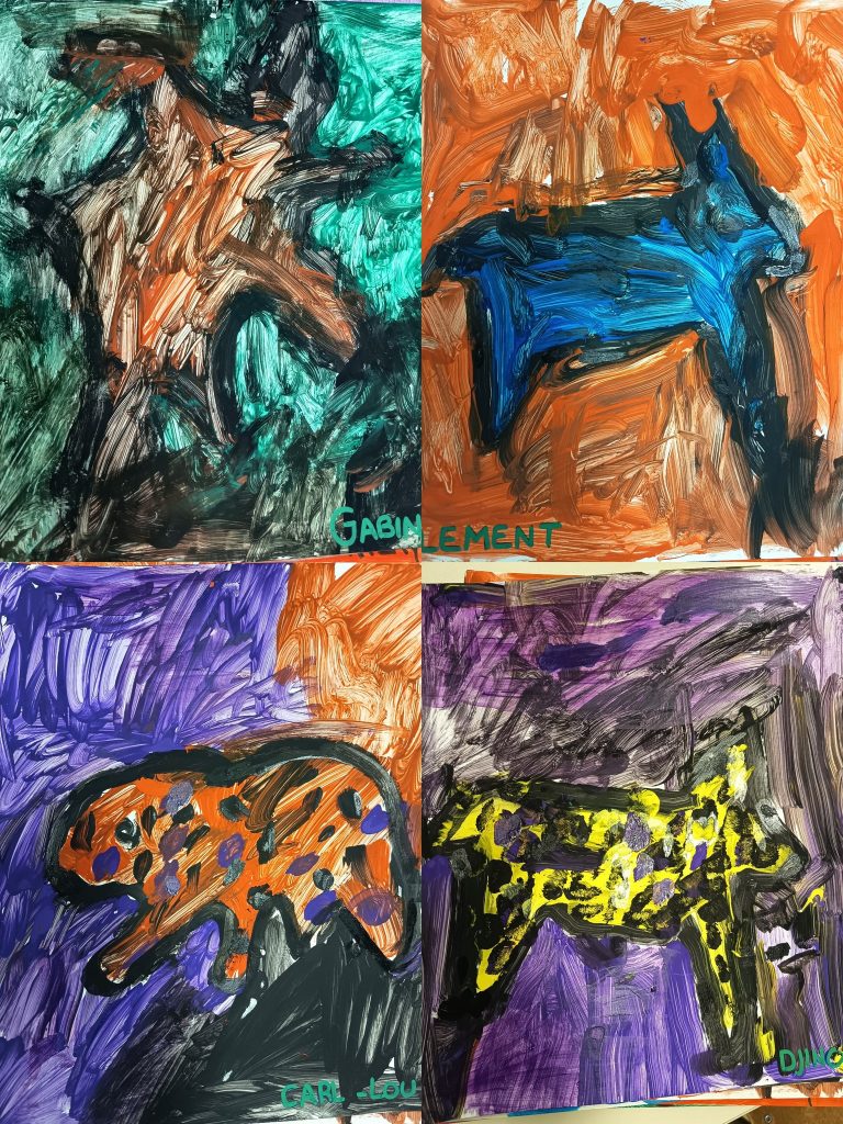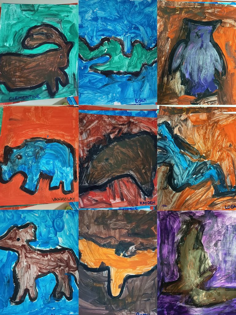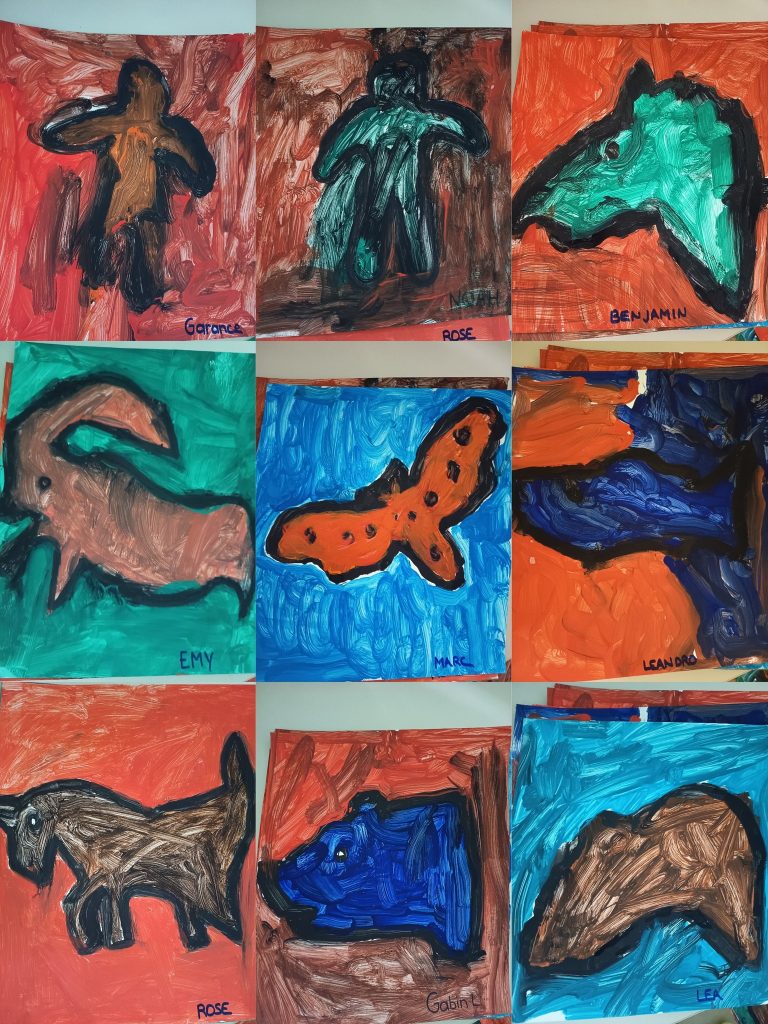 Les MS GS CP : Nous avons choisi un pochoir sur les animaux et empreintes préhistoriques que nous avons ensuite contourné au feutre. Nous avons repassé le contour avec de la peinture noire, puis choisi une nouvelle couleur cette fois-ci pour peindre l’intérieur de la silhouette. Enfin, pour terminer nous avons pris une troisième couleur pour remplir l’espace tout autour d’elle… Le tout en extérieur, au parc et sur chevalets !!!
