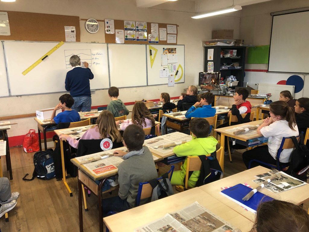Les CE2-CM1 : Nous avons gravé un animal à l’aide d’un silex sur des plaques d’argile.