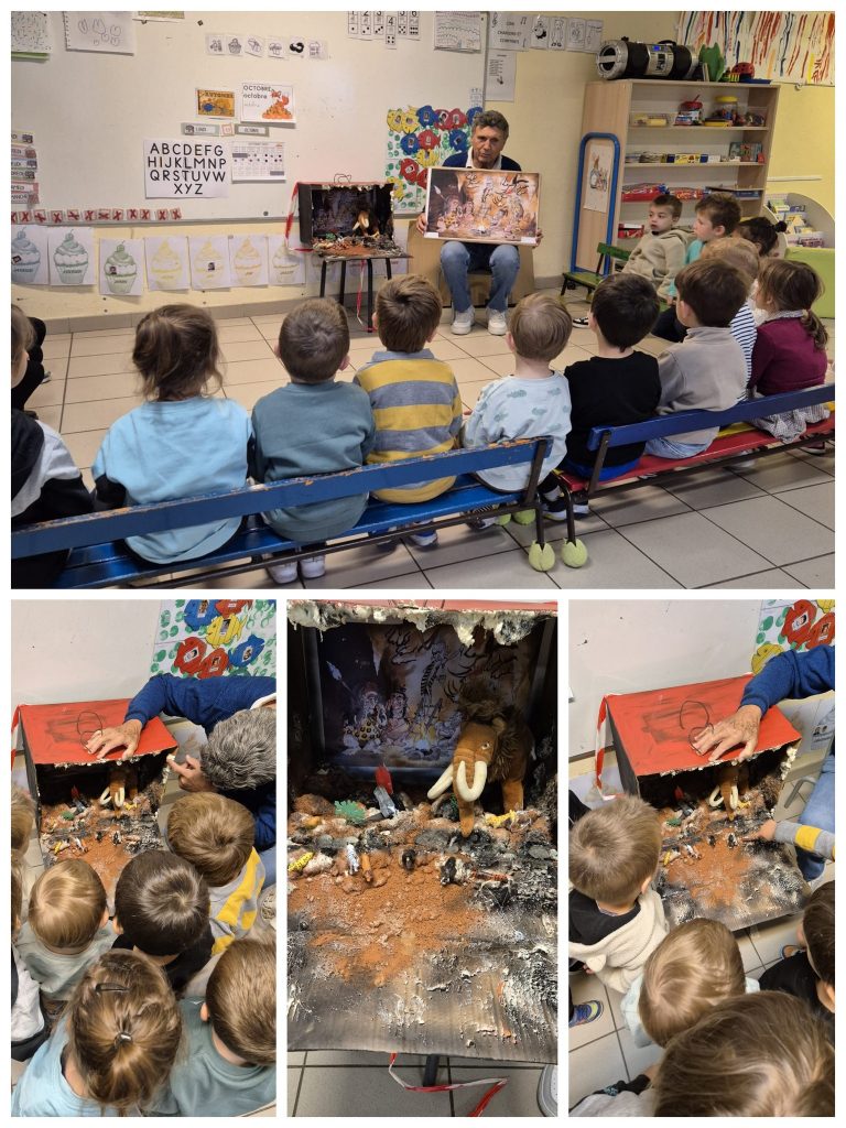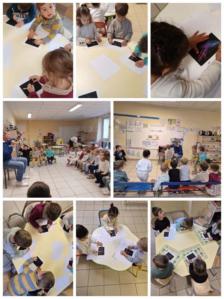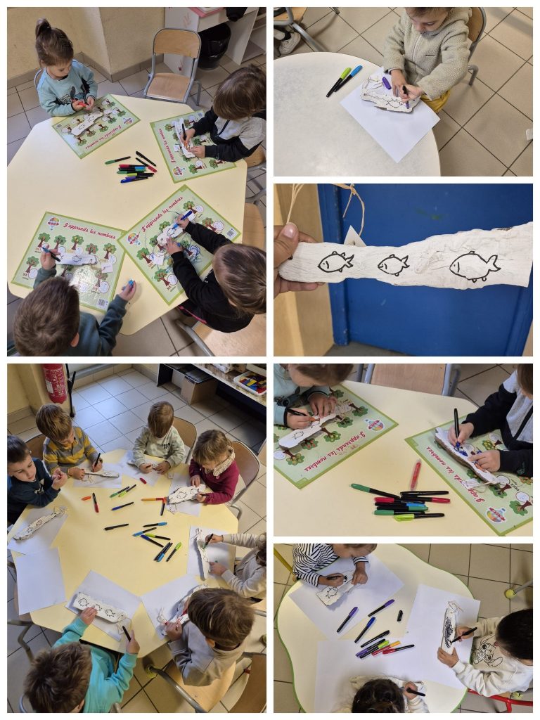 Les TPS-PS-MS : Nous avons préparé nos œuvres d’art après avoir observé une mini grotte dans un carton, très joliment décorée ! Nous avons coloré des poissons sur du bois flotté ! Enfin Guy nous a fait écouter une trompette magique : elle fait le son de certains animaux !