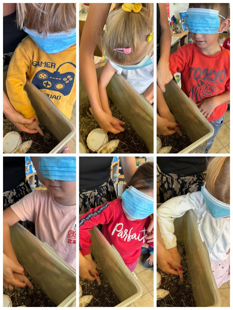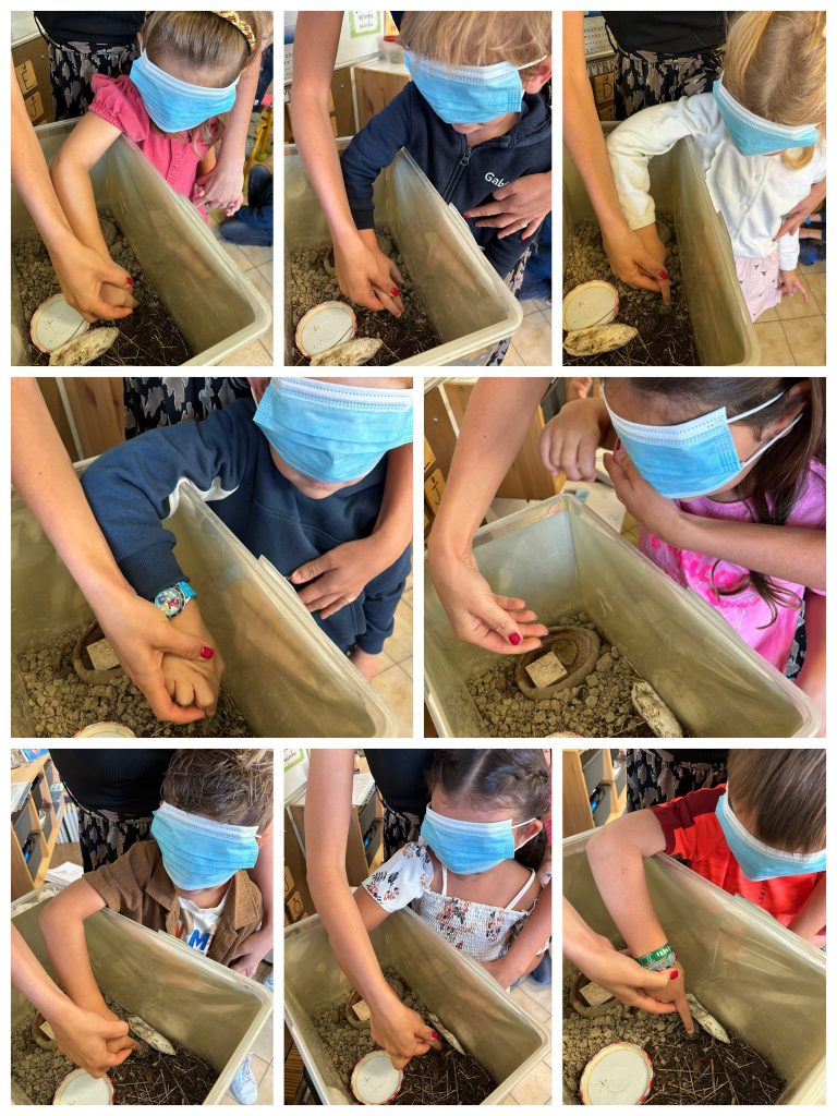 Les élèves ont émis les hypothèses ci-dessus et nous avons procédé par élimination. A la fin nous avions le choix entre le lézard et la tortue … Alors c’est à l’aveugle et par le toucher que nous avons tenté de découvrir notre animal mystère !